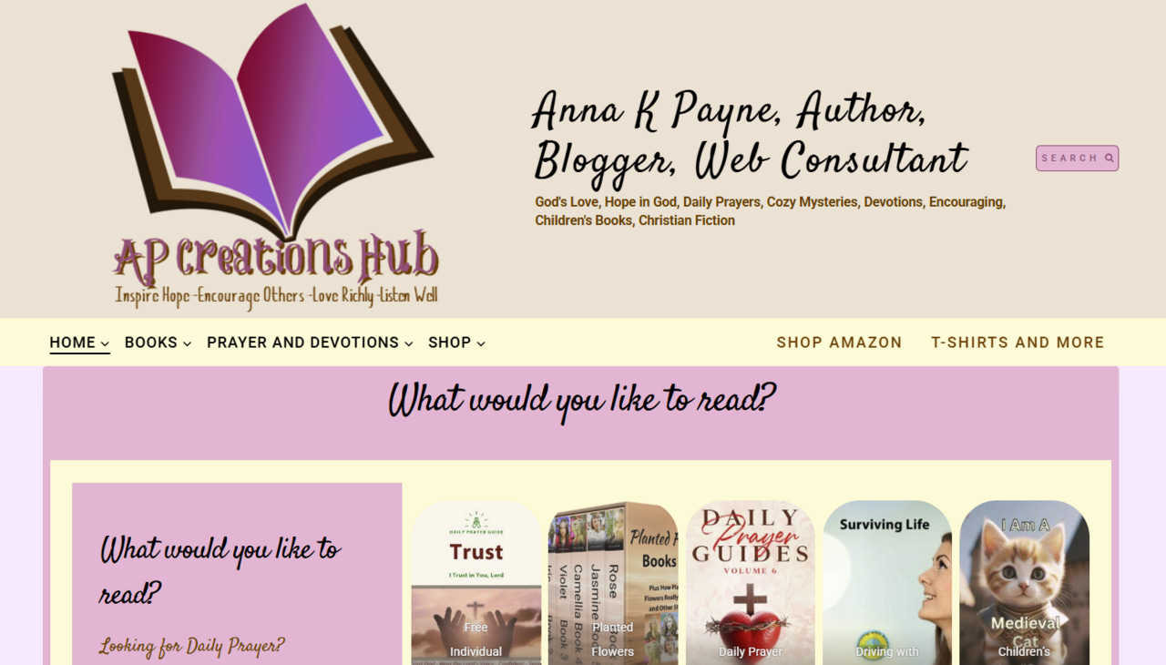 Devotions, cozy mysteries, romantic suspense, inspirational, and children's books to inspire hope, encourage others, love richly, and listen for God's voice.