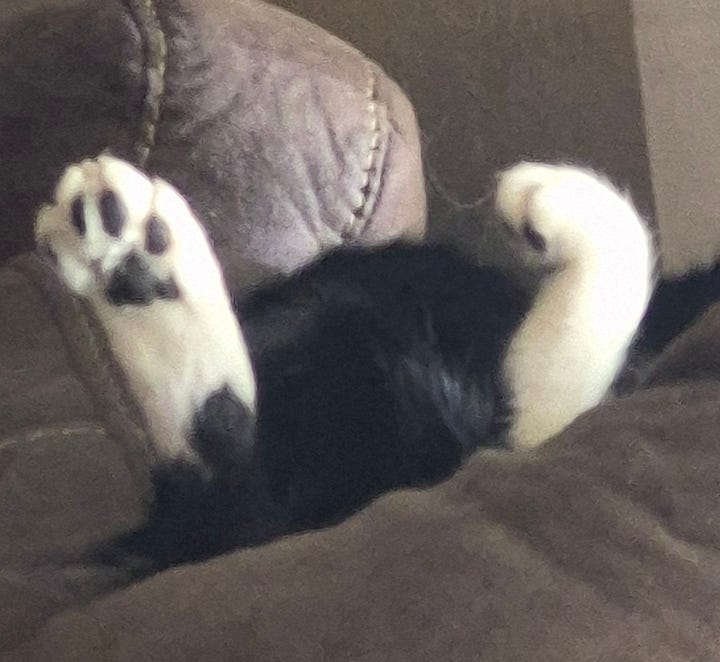 The latest paws-up pictures of Felix. He enjoys napping on the couch back, which sags over 10 inches from his weight, especially on pleasant days when the back door is open. He has the option to go outside if he wants. This is all I can see of him.