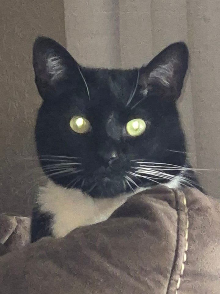 My couch buddy while I’m writing. His eyes are on me. Reminds me that God watches over me. Just as the cat watches over me. Paddy guards me while I sleep as the Lord keeps me safe. When I need to be rescued? Felix hides behind the couch. Oh, well. God is there.